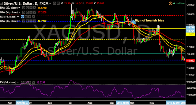 We prefer to go short on XAG/USD around $15.88 with stop loss at $16.12 and target of $15.54.