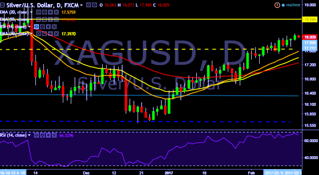 We prefer to go short on XAG/USD around $18.02, stop loss at $18.12 and target of $17.78.