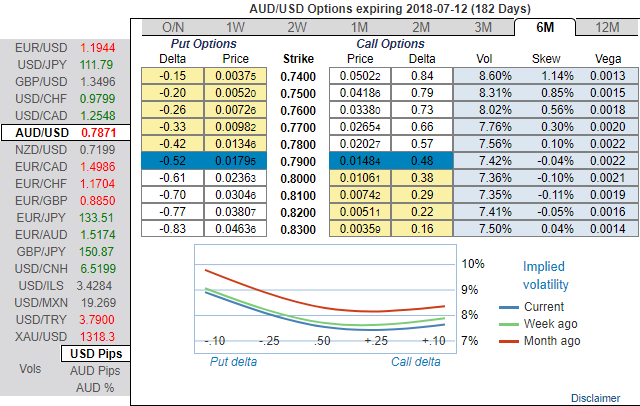 Please be noted that the positively skewed IVs of 6m tenors signify the hedgers’ interests to bid OTM put strikes upto 0.74 levels (above nutshell). Bearish neutral delta risk reversal also indicates that the hedging activities for the downside risks remain intact.