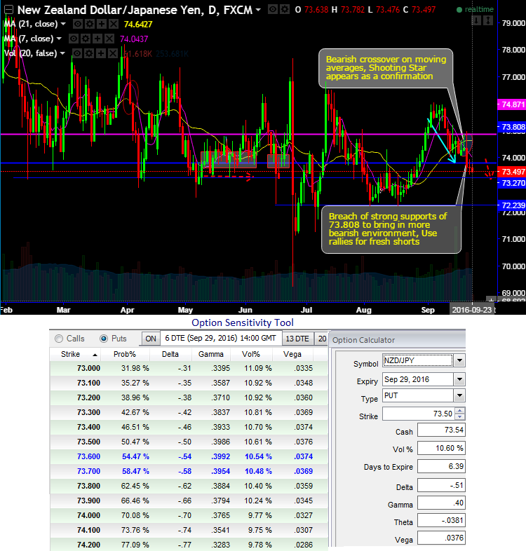 The IVs of NZD crosses are extremely volatile even after RBNZ’s monetary policy, especially the current IVs of 1W NZDJPY ATM contracts are trading at 10.60% and likely to perceive on an average of 10.5% across all OTM put strikes that would divulge pair’s weakness (see 1W-1Y ATM IVs). While vega on the OTM put strikes are comparatively higher that signifies the sensitivity of an option’s value to a change in volatility.