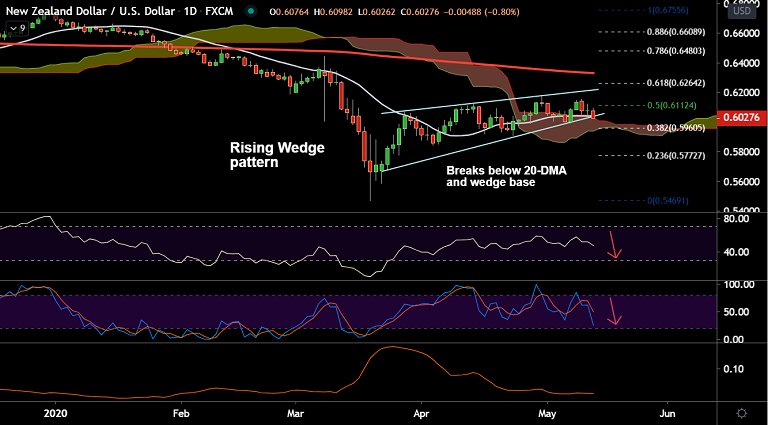 NZD/USD was trading 0.80% lower on the day at 0.6028 at around 02:30 GMT, bias bearish.