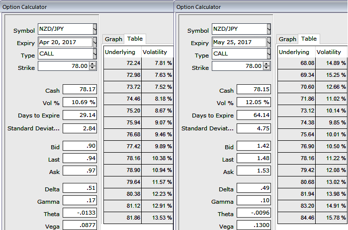 The strategy goes this way: while you're holding longs in spot FX of NZDJPY, go short in 1m (1.5%) OTM striking call and long in 2m (1%) OTM striking put. Since the short term, bullish sentiments are mounting we kept upside bracket little on the higher side.