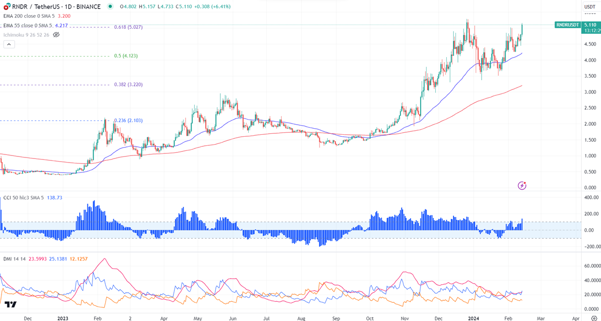 RNDRUSD prices surged more than 20% in the past five days. It hit a high of $5.15 and currently trading around $5.11. The pair is holding well above the short-term (21 and 55-day EMA) and long-term moving average (200-day EMA).