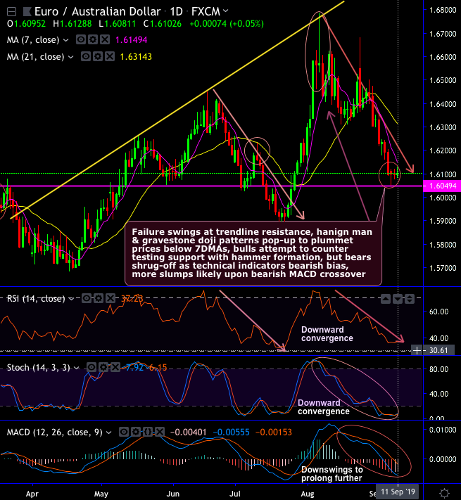 Technical Chart and Candlestick Patterns: EURAUD plummets prices below 7DMAs ever since the failure swings were observed at the trendline resistance, while hanging man and gravestone doji patterns popped-up at that juncture (at 1.6565 and 1.6568 levels respectively).