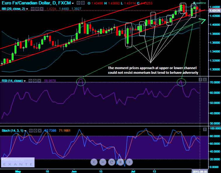 - Channel line: From last one month it is observed that the Euro Canadian pair has been moving in 2nd channel line band width of 270-280 pips. As shown in the diagram it is quite important to note that if prices are trying to break this range then the very next day there would be adverse price reactions which would mean that the major tolerance level for price is around 270 pips. Option traders with speculating perspectives are advised to use futures contracts considering targets of the range as stated above.