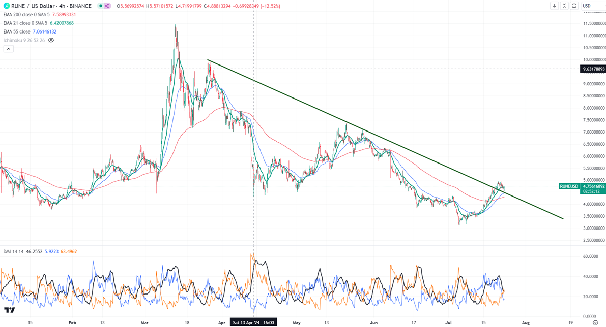 RUNEUSD has gained more than 55% in the past two weeks. The pair holds above the short-term (21 and 55 EMA) and below the long-term moving average in the 4-hour chart. It hit a high of $4.94 and is currently trading around $4.73.