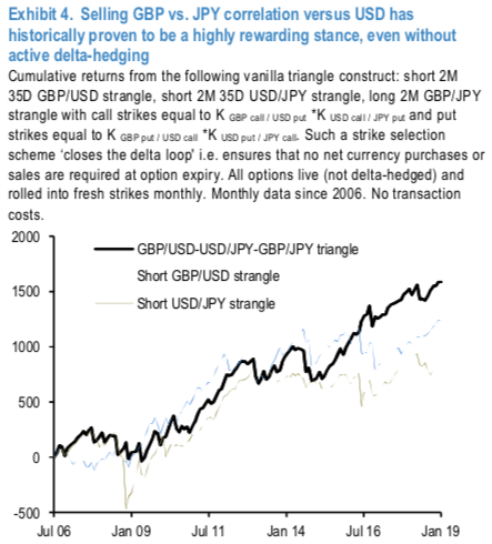 Unlike GBPJPY however, GBPAUD is not a symmetrically profitable triangle play in calls and puts: Exhibit 5 suggests that owning GBP calls/AUD puts (against selling GBPUSD calls and AUDUSD puts) significantly outperforms owning GBP puts/AUD calls, presumably on account of GBPAUD’s traditional anti-risk sensitivity on the upside (i.e. spot tends to rally sharply in crashes).