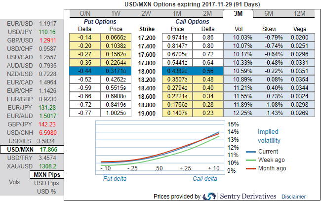 The standout feature of the USDMXN vol surface to us is the cheapness of risk-reversals, both vis-à-vis ATM vols and particularly relative to the amount of carry in forwards that allows for carry efficient expressions of bearish directional views or tail risk hedges.