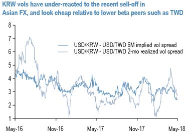 We view the risk/equity beta differential between KRW (higher) and TWD (lower) as a positive for the trade that biases the vol spread wider in broad market stress. Courtesy: JPM