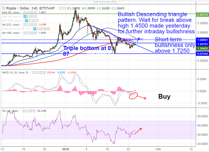 - XRP/USD formed triple bottom at 0.87 and shown a minor recovery till 1.74. The pair started to decline from that level. It is currently trading around 1.38900.