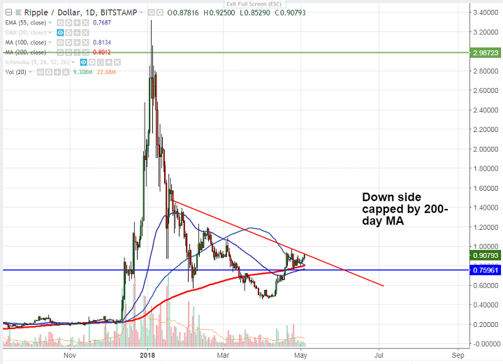 - XRPUSD formed a temporary top around 0.9649 and started to decline from that level. The pair downside capped by 200- day MA. Ripple has shown a dip below 200- day MA till 0.7800 and jumped almost more than 17% from that level. It is currently trading around 0.9090.