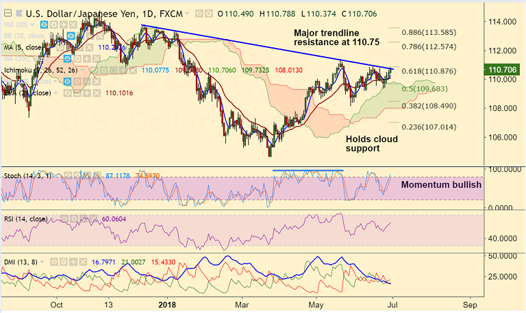 - On the flipside, rejection at trendline resistance to see retrace till 21-EMA (110.10). Break below daily cloud to negate bullish bias.