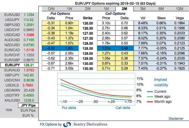 Options Trade Tips (EURJPY): Buy 2m EURJPY (1%) ITM -0.69 delta puts for aggressive bears on hedging grounds. If expiry is not near, delta movement wouldn’t be 1 point increase with 1 pip in the underlying spot FX. Which means if the spot FX moves 1 pip, depending on the strike price of the option, the option would also move less than 1. Thereby, in the money put option with a very strong delta will move in tandem with the underlying. Source: sentrix, saxobank