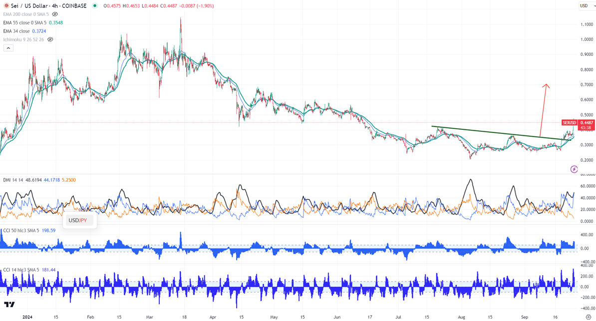 SEIUSD gained more than 81% in the past two days. The pair holds well above the short-term (21 and 55 EMA) and below the long-term moving average. It hit a high of $0.4753 and is currently trading around $0.4499.