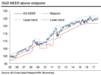 Key drivers: As long as the EUR remains bid, the USDSGD will creep lower. However, assuming the MAS does not tighten in October and Chinese growth starts to slow, the SGD NEER should settle at the bottom of the band.