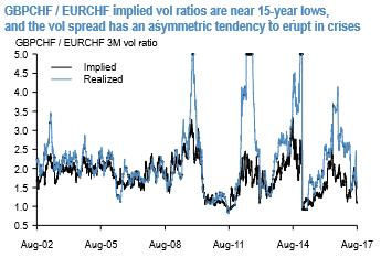 GBPCHF vs EURCHF vol ratios are approaching 15-year lows, nearly at par with extremes first witnessed at the height of the EMU crisis in the fall of 2011 that brought on the 1.20 peg in the first place, and then revisited when it was removed two years ago (refer above chart). Owning the vol spread has a desirable positive asymmetry from current levels, a tendency for one-sided eruptions in favor of a wider GBPCHF premium during market crashes, and enjoys small positive carry at inception (2M ATM vol spread 0.7 mid, 1-mo realized vol spread 1.5).