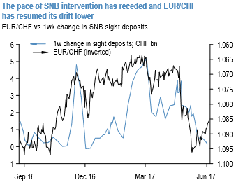 The bounce in EURCHF following the French election has started to slowly fade as the SNB has scaled back its FX interventions, although admittedly this has come with a lag. SNB interventions had picked up to a weekly pace of CHF 2.4bn in April in the lead up to the French elections as EURCHF approached 1.0675.