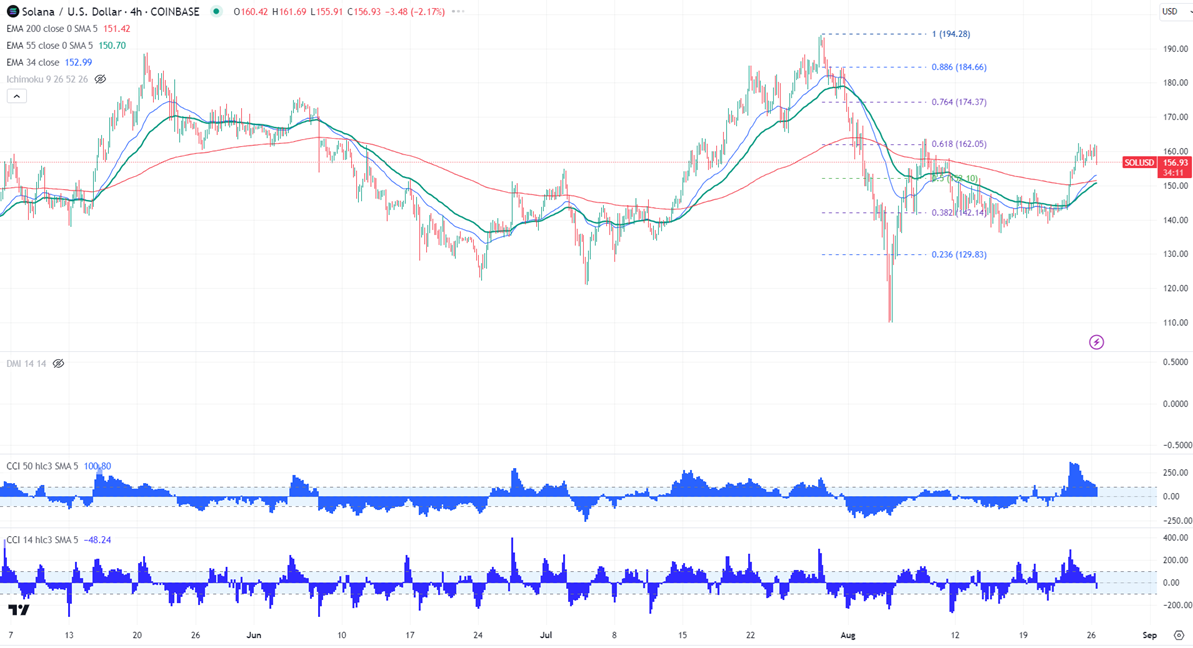 SOLUSD showed a minor sell-off after a jump of more than 15%. The pair holds above the short-term (21 and 55 EMA) and long-term moving average in the 4-hour chart. It hit a high of $162.36 and is currently trading around $157.