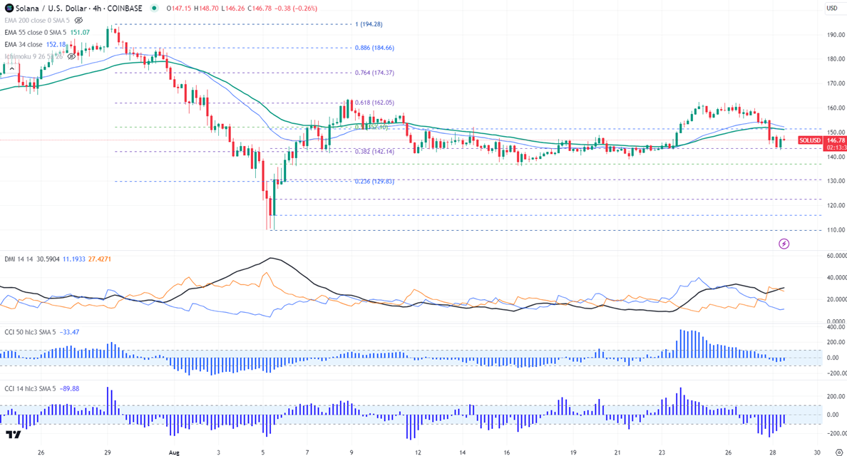 SOLUSD declined for a third consecutive day as the global crypto market turned weak. The pair holds above the short-term (34 and 55 EMA) and long-term moving average in the 4-hour chart. It hit a low of $142.73 and is currently trading around $147.02.