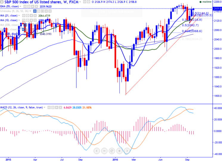 - S&P500 has shown a fast recovery from the low made on this week at 2141. It is currently trading around 2170.50.