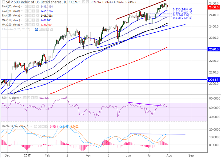 - S&P500 formed a temporary top around 2480 and started to show a minor decline from that level. It is currently trading around 2467.