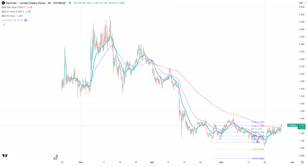 STRKUSD gained more than 30% in the previous week. The pair holds well above the short-term (21 and 55 EMA) and below the long-term moving average (200-EMA) in the 4-hour chart. It hit a high of $1.323 and is currently trading around $1.314.