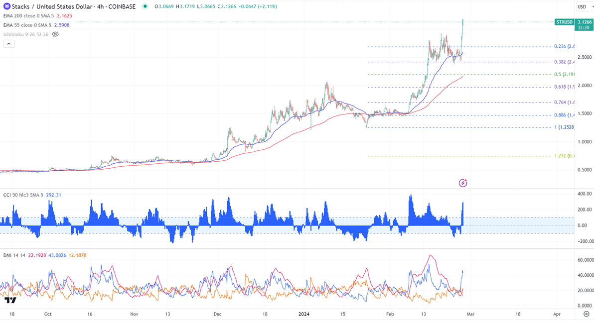 STXUSD gained more than 30% in the past four days as BTC hit a 25 month high. The pair holds well above the short-term (21 and 55 EMA) and long-term moving average. It hit a high of $3.18 and is currently trading around $3.15.