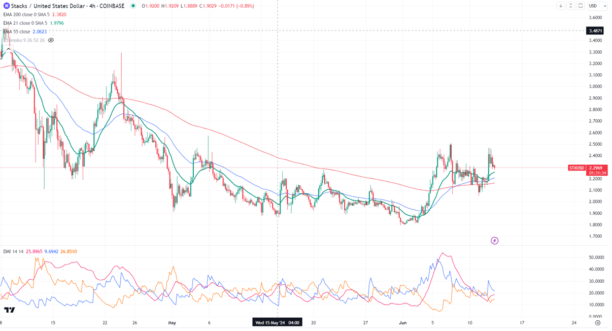 STXUSD gained more than 20% in the past four days as BTC reamins bullish. The pair holds well above the short-term (21 and 55 EMA) and long-term moving average. It hit a high of $2.509 and is currently trading around $2.308.