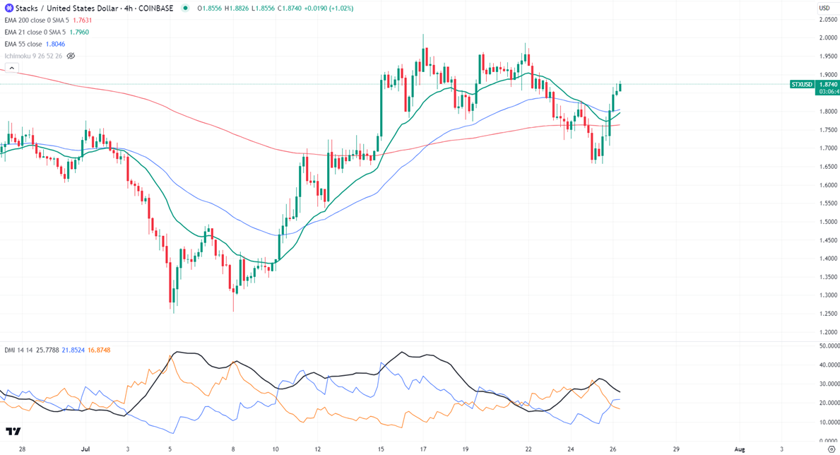 STXUSD gained more than 13% in the past two days as BTC showed a nice pullback. The pair holds well above the short-term (21 and 55 EMA) and long-term moving average. It hit a high of $1.885 and is currently trading around $1.879.