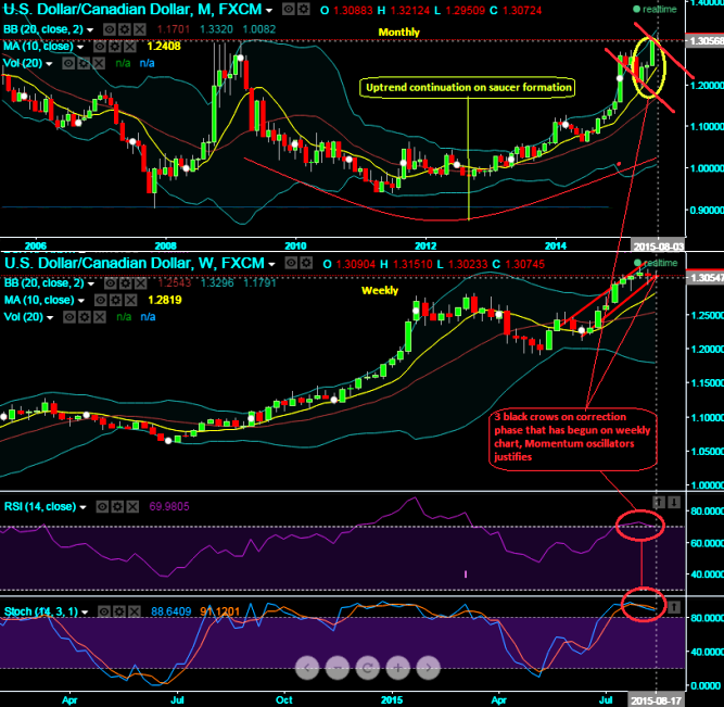 Long term charts evidences the saucer pattern on this pair, a rounding bottom of the prolonged downtrend can used to suggest that the long term trend is reversed. Currently the pair is testing trendline support at 1.3070 levels, if we have to compare the same with monthly plotting then we arrive with 3 black crows in a row which signals short term correction.