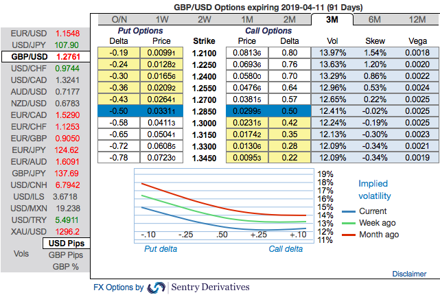 Positive bids are observed in the GBPUSD risk reversals of short-term tenors. While positively skewed implied volatilities of 3m tenors still signal bearish hedging sentiments. To substantiate this downside risk sentiment, risk reversals have also been bearish.