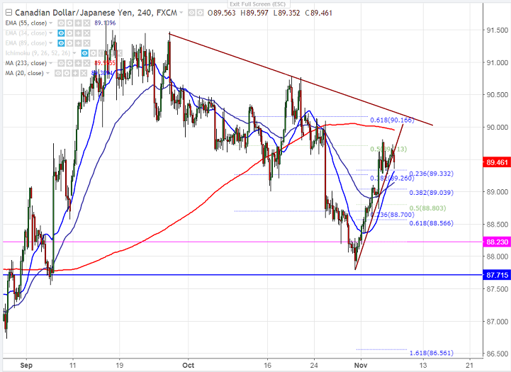 - CADJPY formed minor bottom at 87.78 and started to jump from that level. The pair hits intraday high of 89.73 and started to decline. It is currently trading around 89.44.