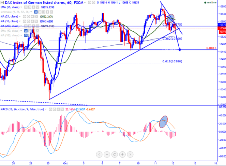 - DAX has slightly recovered from the low of 10546 made yesterday. But its upside is capped by21- HMA and any break above 10615 will take the index to next level at 10650/10706 (Sep 22nd 2016 High).