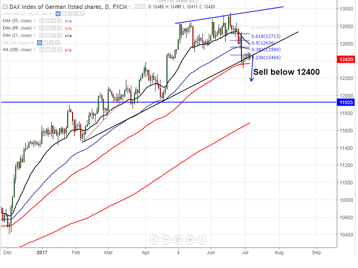 - DAX30 has shown a minor decline below trend line support and recovered slightly from that level. The index made a low of 12310 and is currently trading around 12451.