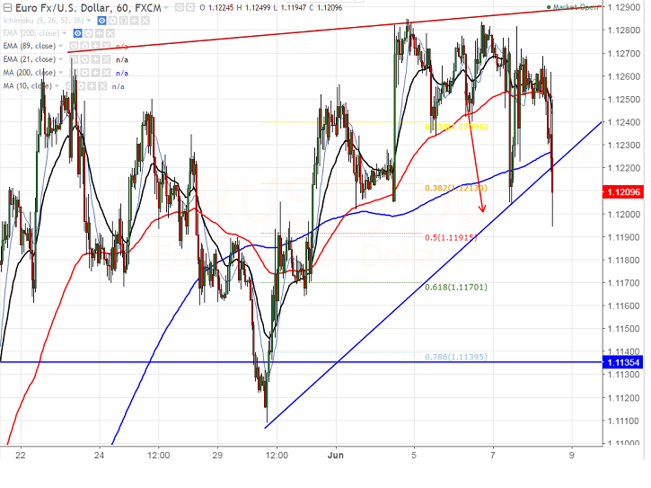 - EUR/USD declined slightly after ECB meeting. ECB has kept its interest rates unchanged at 0% and dropped any reference for further rate cut. It is ready to extend its QE program if needed. The pair dipped till 1.12060 and is currently trading around 1.12103.