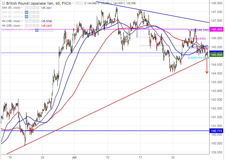 - GBP/JPY formed a minor top around 146.55 on Jun 27th 2017 and declined slightly from that level. It has declined till 145.12.