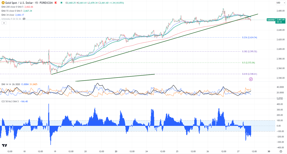 Gold pared some of its gains due to profit booking. It hit a high of $2670 and is currently trading around $2660.