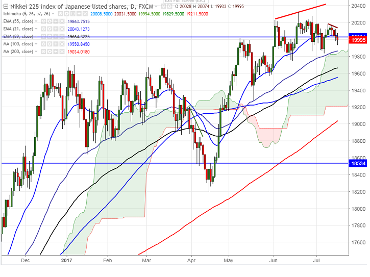 - Nikkei declined slightly from the high of 20182 made on Jul 11th 2017 on account of stronger yen. The pair declined slightly below 20000 level. It is currently trading around 19988 0.24% lower.