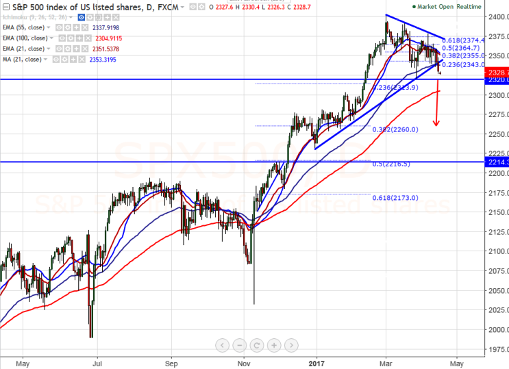 - S&P 500 made a low of 2321 on Mar 27th 2017 and jumped slightly from that level. The index rised till 2378 and started to decline from that level.