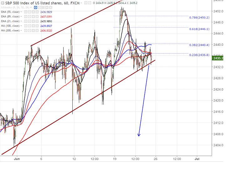 - S&P500 has formed temporary top around 2453 on Jun 19th 2017 and declined slightly from that level till 2430. It is currently trading around 2435.9.