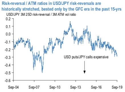 USDJPY risk-reversals have been persistently bid through the back half of last year and most of this, so much so that RR/ATM ratios have now reached levels reminiscent of GFC era extremes (in favor of JPY calls, refer 1st chart) despite nominal pricing of Yen options being orders-of- magnitude more benign today. It may be tempting to associate this apparent “distortion” with the risk-bearishness – and attendant hedging demand for Yen calls – brought about by the long-simmering US/China trade conflict. The reality is far more mundane however, and rooted in the currency hedging preferences of Japanese institutions and corporates as the Fed – BoJ policy rate gap widened over the past 12-18 months. Instead of incurring the steep negative carry of selling USDJPY forwards (to the tune of 250-300bp) to cover FX risks of USD receivables /US bond exposures, Yen buying flows have increasingly taken the form purchasing USD puts/JPY calls on risk-reversals that were judged to be relatively inexpensive vis-a-vis forwards.