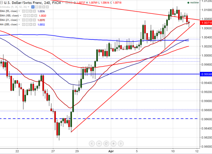- USD/CHF formed minor top around 1.01078 on Apr 10th 2017 and declining from that level. The pair declined till 1.00616 and is currently trading around 1.00707.