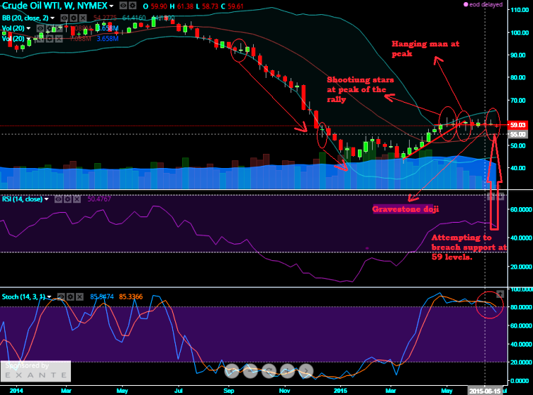 The hanging man pattern which was occurred at 60.30 levels at the end of May needed a confirmation, now that has been backed up by both oscillating indicators (RSI & stochastic) showing downward convergence with the falling price and flurry of bearish candlestick patterns have been displayed back to back.