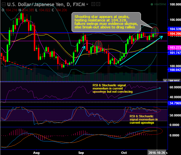 The shooting star appears at peaks, testing resistance at 104.328, failure swings may evidence slumps, else break-out above to drag rallies.