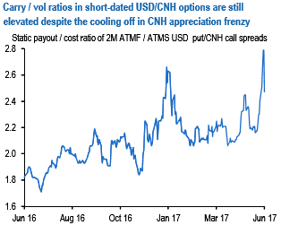 One place where there is scope to deviate from this script is CNH. Markets’ sights were trained firmly on China this week given the multi-sigma collapse in USDCNH. The spike in front-end vols and the nosedive in risk-reversals are overdone in our view as the bulk of the CNH’s catch-up room vis-a-vis the rest of the region is now exhausted, and we recommend selling that risk premium via -6w/+3M calendar spreads and AUD-CNH 2M vol spreads.