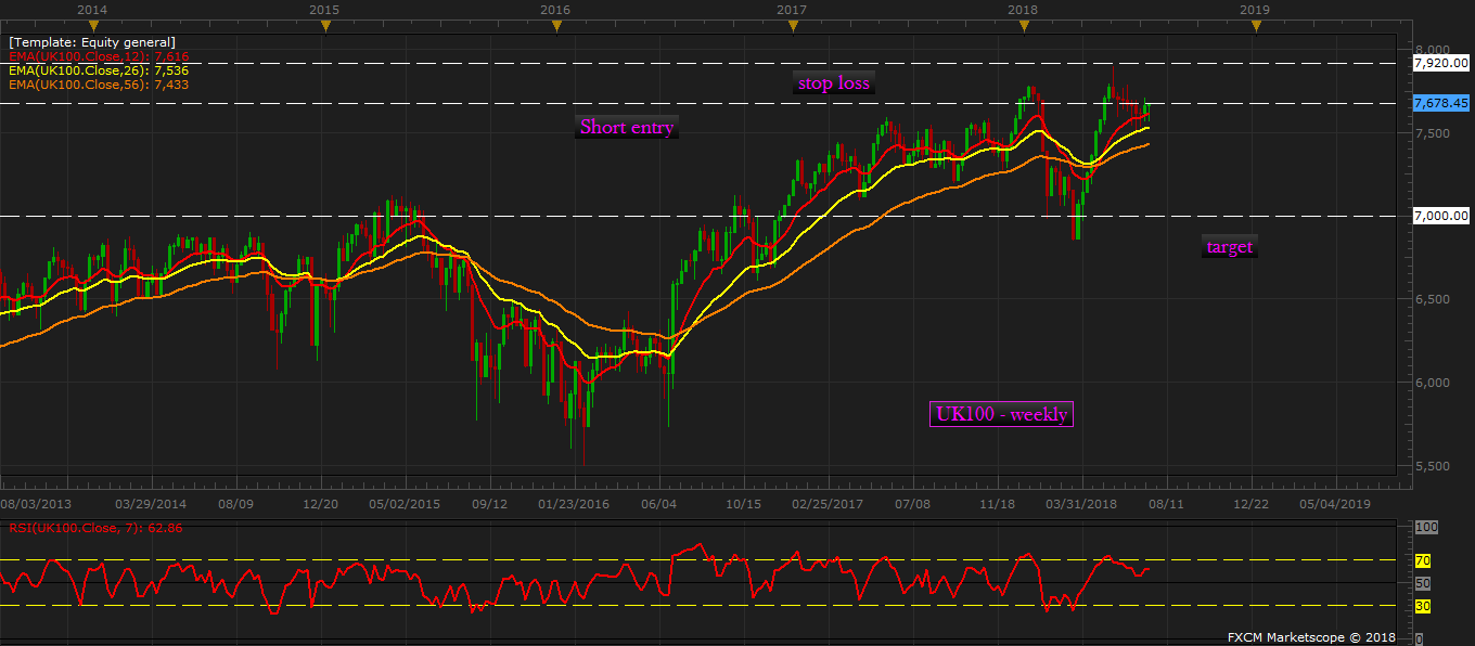 Sell FTSE 100 or UK100 at the current rate of 7680 (UK100) with a target of 7000 area and the stop loss around 7920 area.
