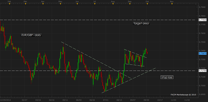 - Buy Euro against Pound, at current price of 0.736, with first target at 0.753 area and second at 0.776 area. Stop loss for the trade is around 0.717 area.