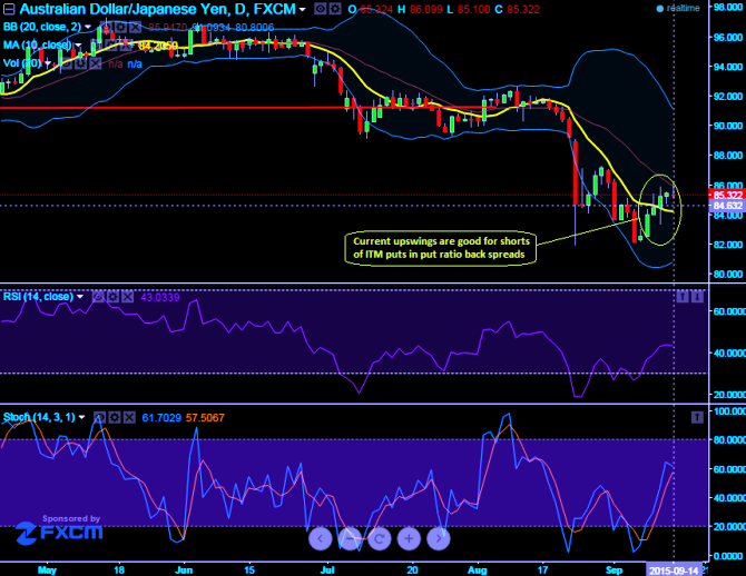 Those who have AUDJPY put ratio back spread, that shorting in the money puts while constructing put ratio back-spreads are functioning well as the pair has been showing upswings from last week, it has spiked up to 86.009 levels, so that the current shorts would go worthless and entire premiums can be spared as absolute profits.