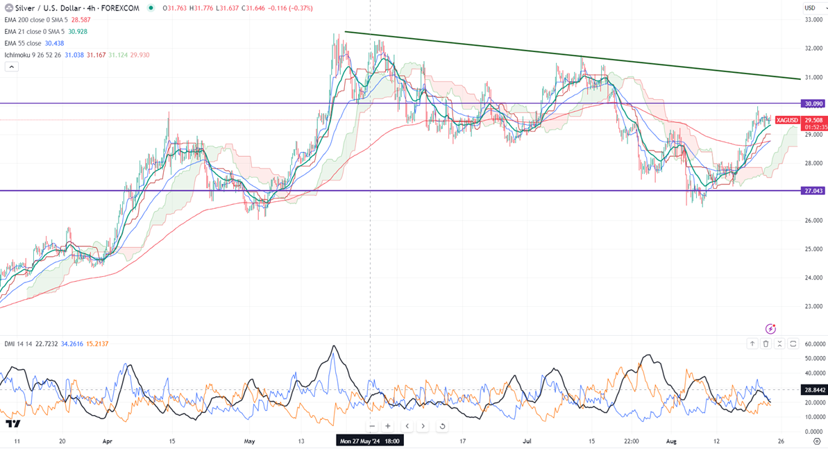 It trades above 21, above the 55- EMA and 200 EMA in the 4-hour chart. The near-term support is around $29.10 and a break below the target of $28.60/$28. On the higher side, immediate resistance is around $30 and any breach above targets is $30.90/$31.75/ $32/$32.50.