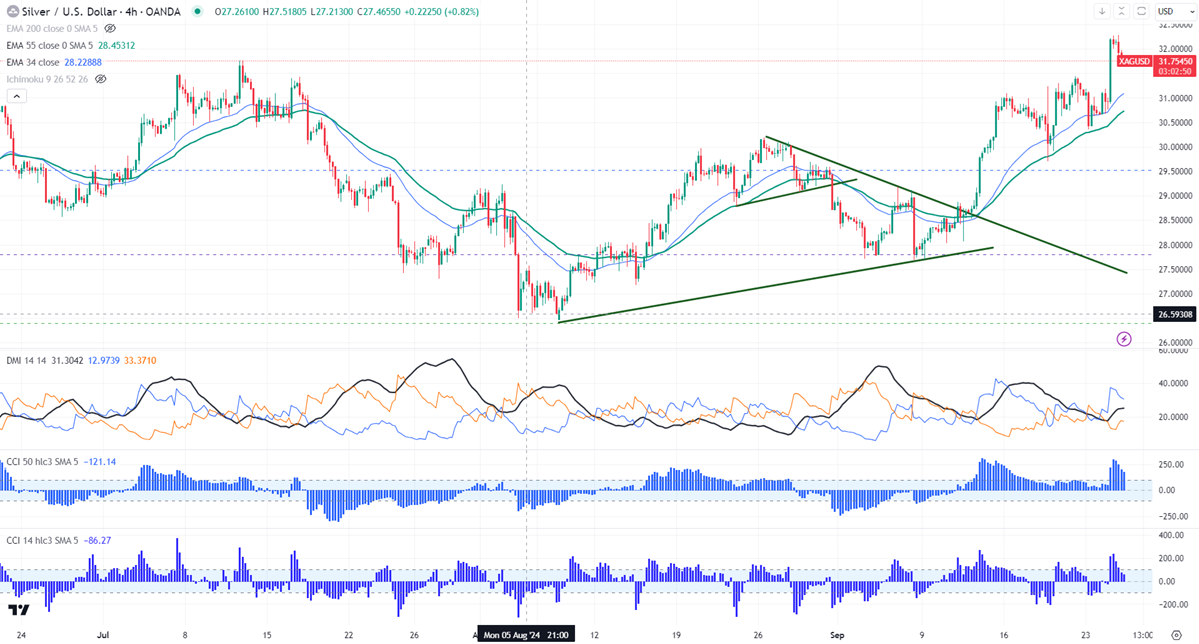Silver jumped more than $2 as Chinese fresh stimulus increased the demand for metals. It hit a high of $32.25 and is currently trading around $31.77.